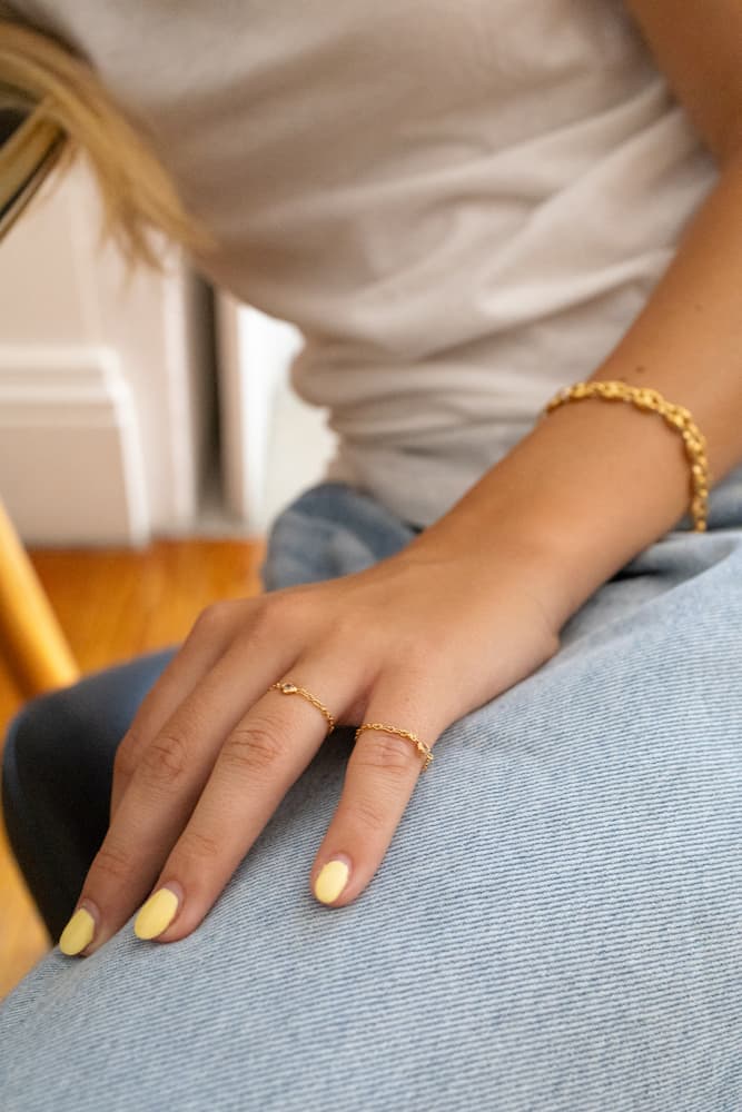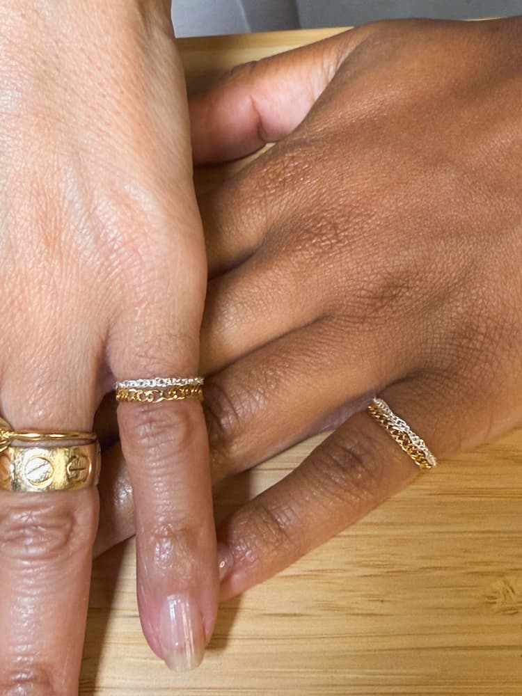 Os anéis permanentes são criados diretamente no teu dedo, com a corrente e o estilo que escolheres. A grande vantagem é a personalização total: não existem tamanhos fixos, cada anel é moldado para ti, no momento. Apesar do nome, não são definitivos — podes retirá-los quando quiseres.